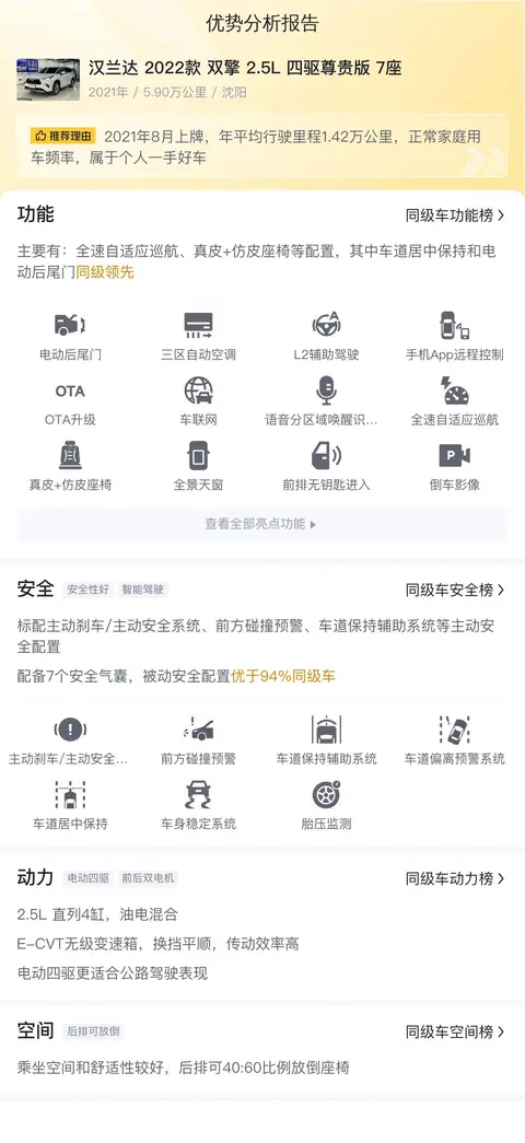 综上所述,汉兰达2022款双擎2.5L四驱尊贵版7座是一款集豪华、科技和实用于一体的中大型SUV。它不仅能满足家庭出行的各种需求,还能为驾驶者带来愉悦的驾驶体验。作为一款二手车,汉兰达2022款双擎2.5L四驱尊贵版7座同样具有较高的性价比和保值率,是一款值得考虑的车型。