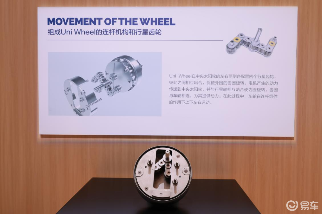 据车则了解,UNI WHEEL由一个布置在中央的太阳轮和布置在其两侧的四个行星齿轮组成,它们彼此之间相互啮合,并在齿圈里转动。当电动机产生的动力传递到太阳轮后,两侧的行星轮会相互啮合,使齿圈旋转,齿圈再与车轮相连,为车轮的转动提供动力。