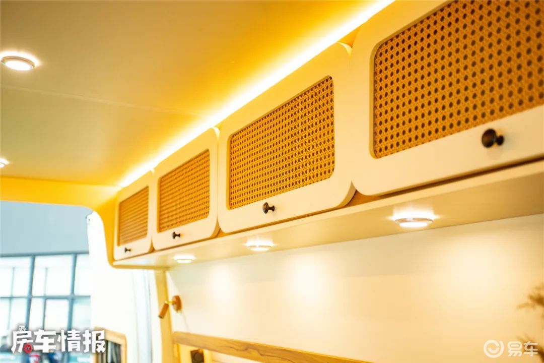 床铺上方两侧还提供了多个储物柜,柜门采用这种类似藤编的处理方式,看起来十分讨喜,关键是细节做工真心不错。其中一个储物柜里还隐藏着一台房车专用变频空调。