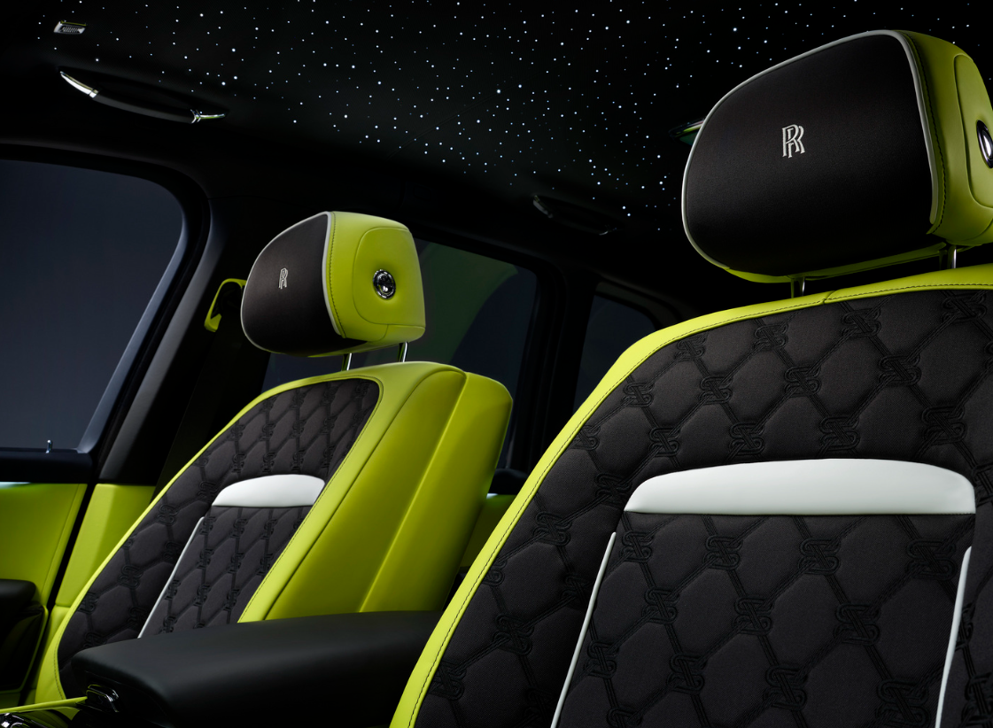库里南是少数我觉得白色车身也非常好看的车型之一,黑白撞色加上与内饰相呼应的浅绿色手工绘线,只能说车主性格可能比较闷骚...言归正传,当你在马路上看见一台劳斯莱斯时,一定会发现它的轮毂标永远垂直于地面。而这一次,库里南首次配备了23寸轮毂,而且每个轮毂均由铝锭铣削制成。