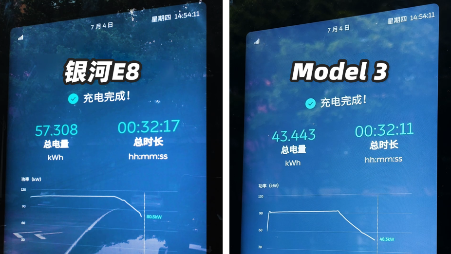 但最后的时间出来后,两台车的充电时间竟然非常接近,ModeL3 的充电时间为32分11秒,充了43度电,而银河E8的时间为32分17秒,充了57度电,两者之间只相差了6秒。