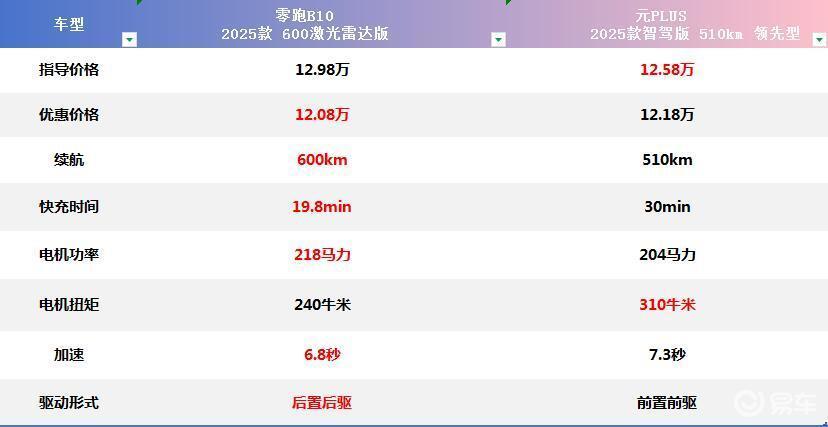 不难发现,零跑B10的指导价格要贵一些,然而,零跑B10具有5000元的购置税补贴,还有4000元的增换购补贴,实际价格为12.09万,如果分期购车,还有5000元的金融补贴,其实际价格还会更低。元PLUS的优惠幅度为4000元,其实际价格为12.18万,两款车的实际价格基本保持一致。