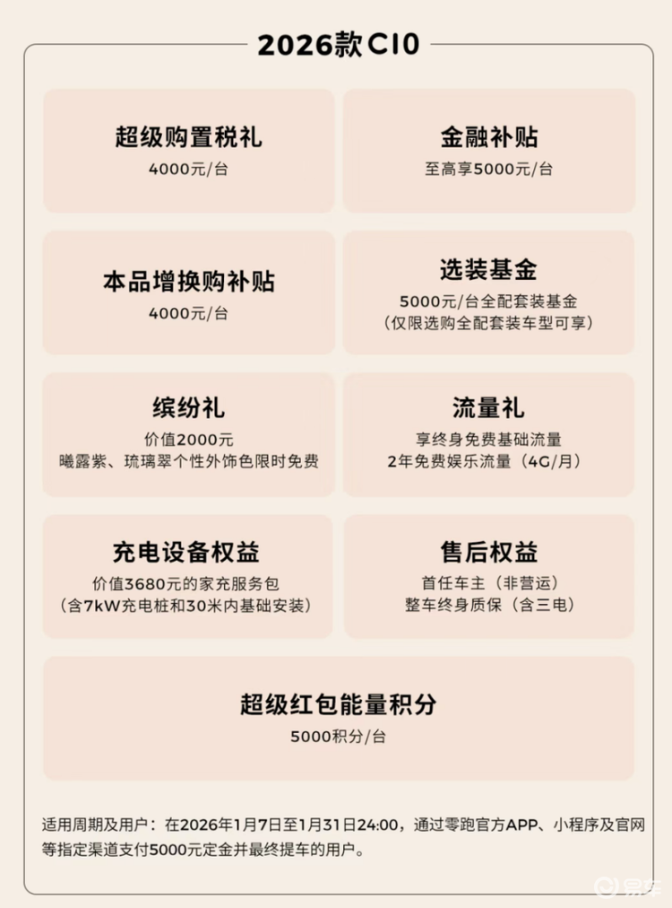 而从价位段来看,零跑C10主打的是11-13万价位段市场,去年整年卖出15.9万台,在新能源中型SUV市场,的确成绩亮眼。关键是进入2026年,各大品牌都针对权益进行缩减,零跑C10在有亲民价格的基础上,依旧在权益上给出诚意——现在买零跑C10,就有4000元购置税补贴,还送家充桩+整车质保,可以说权益涵盖购车、用车、售后各方面,打消车主后顾之忧。