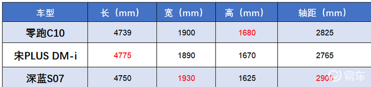 对于家用SUV来说,消费者更在意空间上的表现,特别是过年走亲访友,这台车不仅要装下一车人,还得有地方摆放各种礼盒、水果,自然需要有舒适氛围和宽敞空间了。这三台车中,宋PLUS DM-i长宽高为4775*1890*1670mm,轴距2765mm,深蓝S07长宽高为4750*1930*1625mm,轴距2900mm,零跑C10长宽高为4739*1900*1680mm,轴距2825mm,可以发现,三台车型尺寸各有侧重,一时间不分上下,但是从日常用车来看,还是略有区别的。