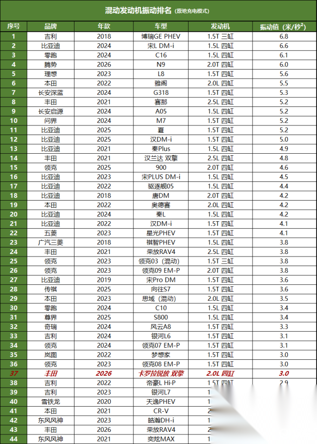 这辆车搭载了一台2.0L四缸发动机,强制充电状态下,怠速振动数值为3.0米/秒²。