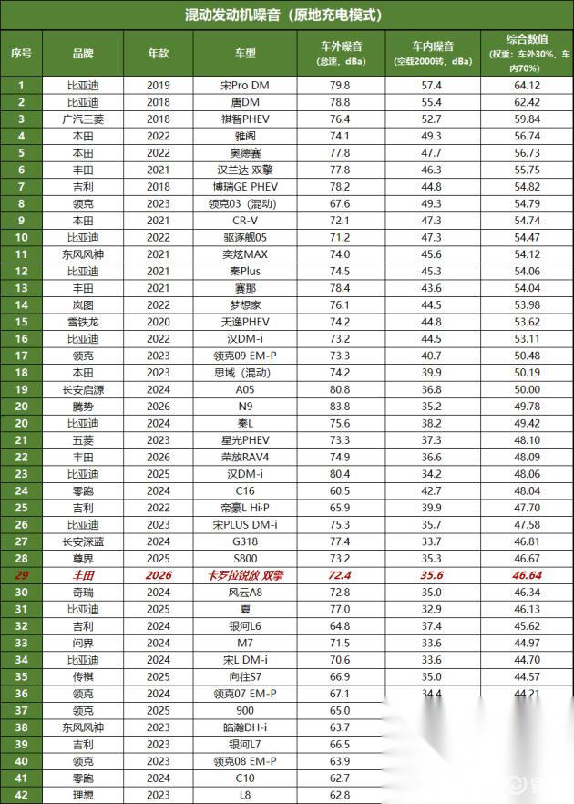 测试方法:发动机完全热机,水温正常,关闭空调,正常怠速下进行测试;打开发动机盖、取下引擎罩,在距离发动机机体上方20厘米处,进行噪音采集,取平均值,为车外发动机噪音数值(dBa);在车内,将车窗关闭,发动机空载运转2000转/分,将噪音仪置于方向盘正上方,取平均值,为车内发动机噪音(dBa)数值。并且以车内30%,车外70%的权重进行综合计算。
