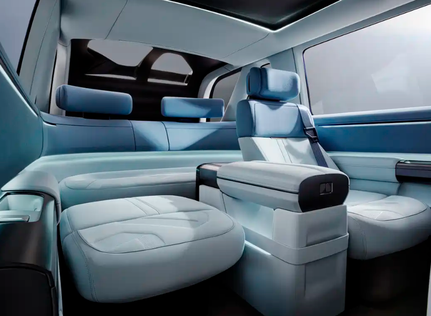 座椅采用环保织物材质,提供六座布局,二排配备中岛台,三排为环抱式设计,可满足多场景使用需求,内饰以实用为主,未添加过度豪华化装饰。