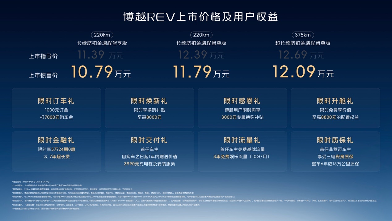 博越REV此次上市推出三大版型,上市惊喜价10.79万-12.09万元,较预售价格直降2万元,其中375km超长续航版本仅12.09万元起,以亲民价格将20万级高端增程配置下放,真正实现长续航增程技术全民平权。