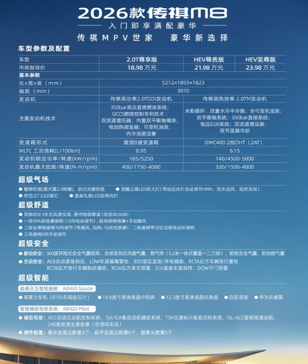 本次上市的2026款传祺M8 2.0T仅推出尊享版一款配置,真正实现入门即满配、起步即旗舰,彻底告别繁琐选装与配置纠结。