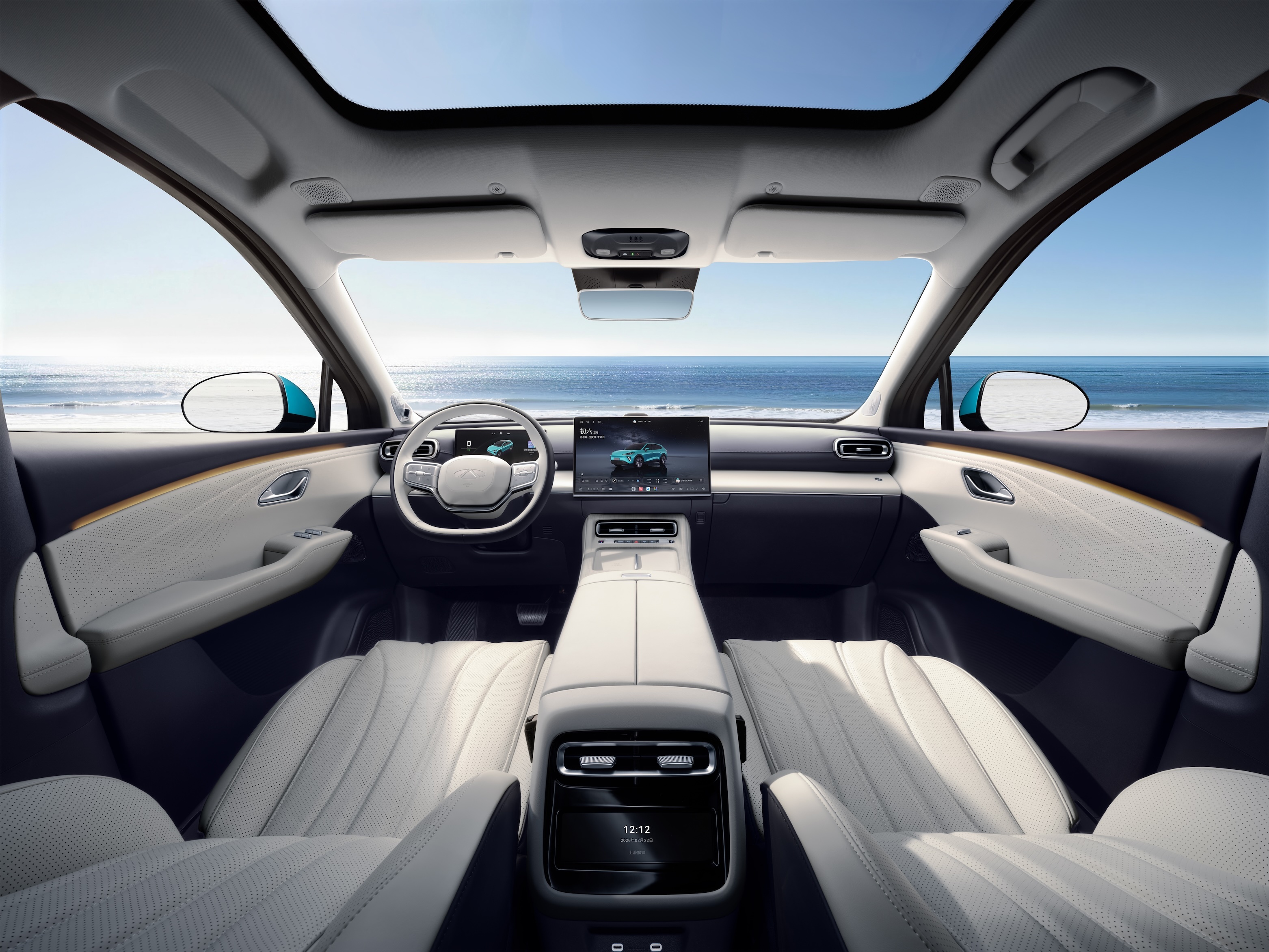 座舱方面,新车首搭3nm制程的8678芯片,CPU算力280k DMIPS,GPU算力4TFLOPS,NPU算力54TOPS。配备15.6英寸2.5K中控屏及10.25英寸仪表盘,车机系统为风云UI 2.0,支持AI语音大模型及全品牌手机互联。顶配及次顶配车型提供17.3英寸后排吸顶娱乐屏选装。